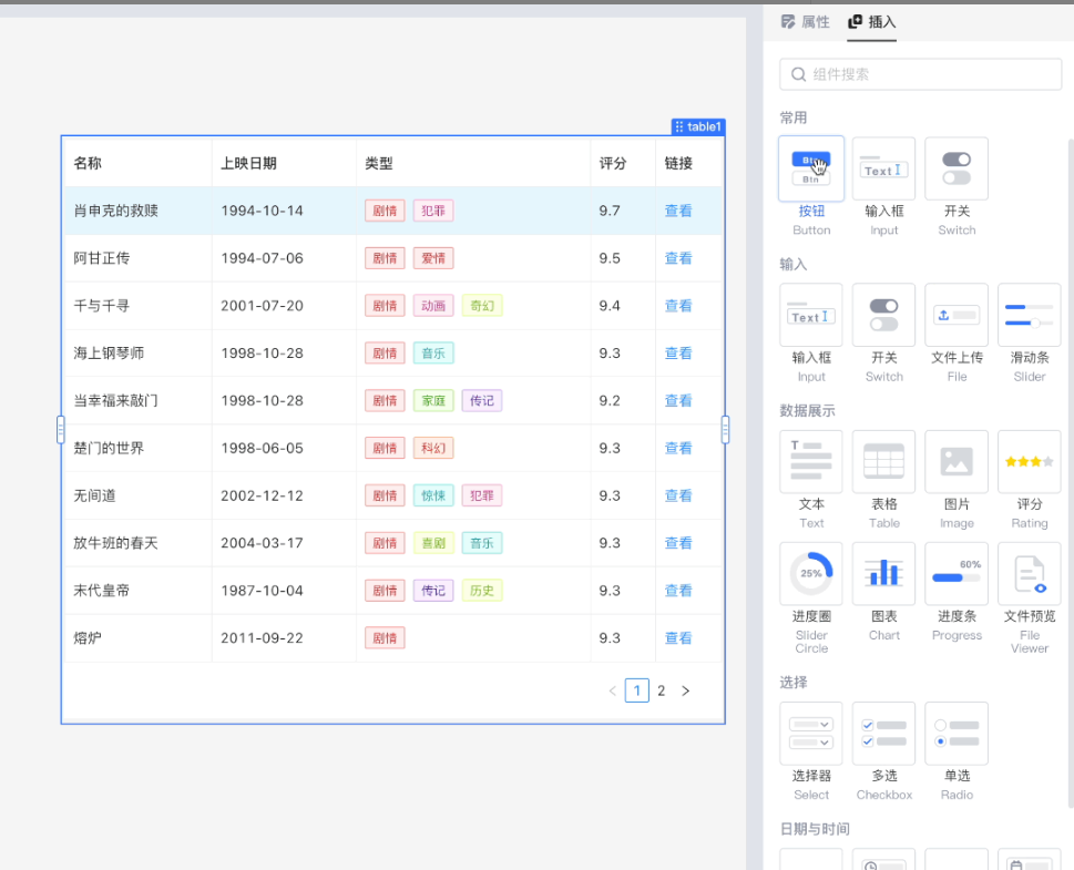 拖放式组件库,包括表单、表格、图表、按钮等。 -