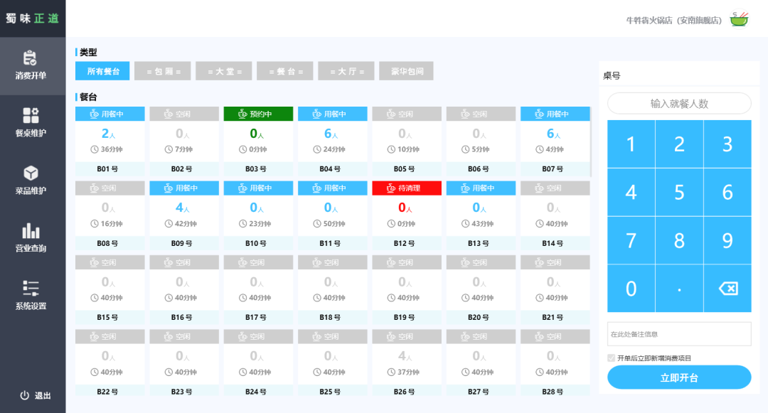 选择空闲餐桌并录入用餐人数后,可操作“立即开台”进入消费项目界面。 -