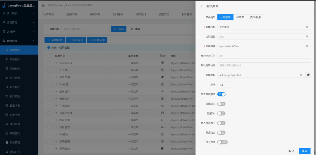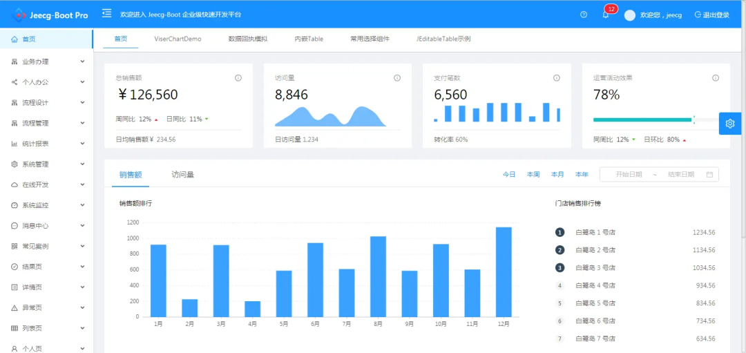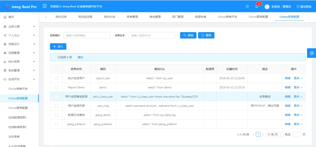 • 低代码开发:支持Online在线表单、报表、仪表盘等,无需编码.