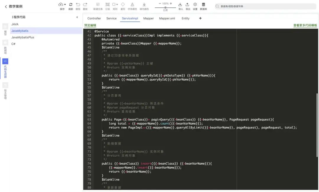 代码生成:内置Java、Mybatis、MyBatisPlus等常规情况下Controller、Service、Mapper的生成,也添加了C#语言支持,用户可自行扩展对其他语言的支持。 -