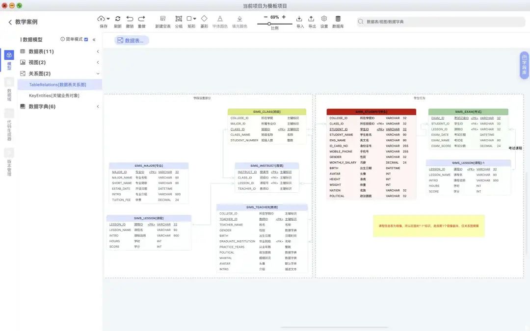 ER关系图:支持数据表绘制ER关系图至画布,也支持概念模型等高阶抽像设计,帮助用户更好地理解和展示数据库结构。 -