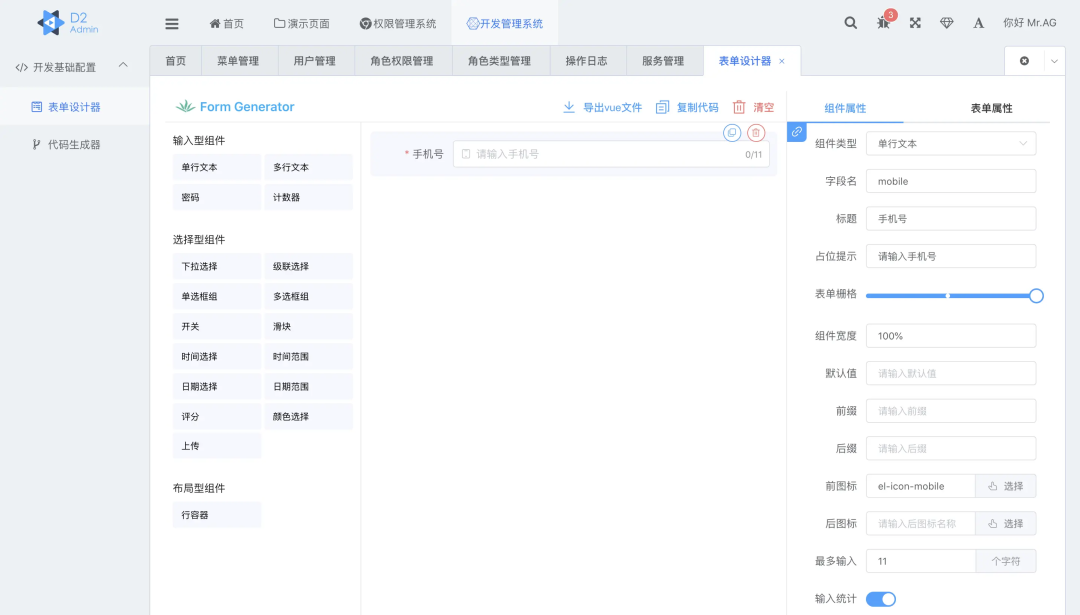 • 前端: vue-element-admin组件、d2admin中台化前端框架.