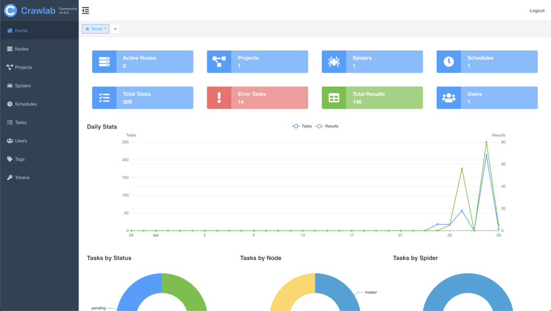 前端界面:平台提供美观的前端界面,用户可以通过浏览器访问平台,查看和管理爬虫任务、节点状态、任务日志等信息。 -