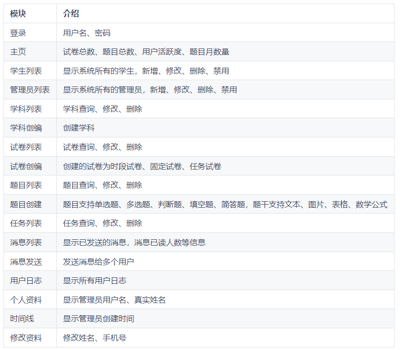 用户管理:支持学生、管理员等多种用户角色的管理,包括新增、修改、删除、禁用等操作。 -