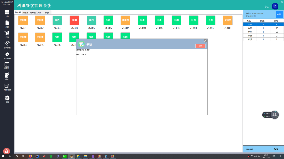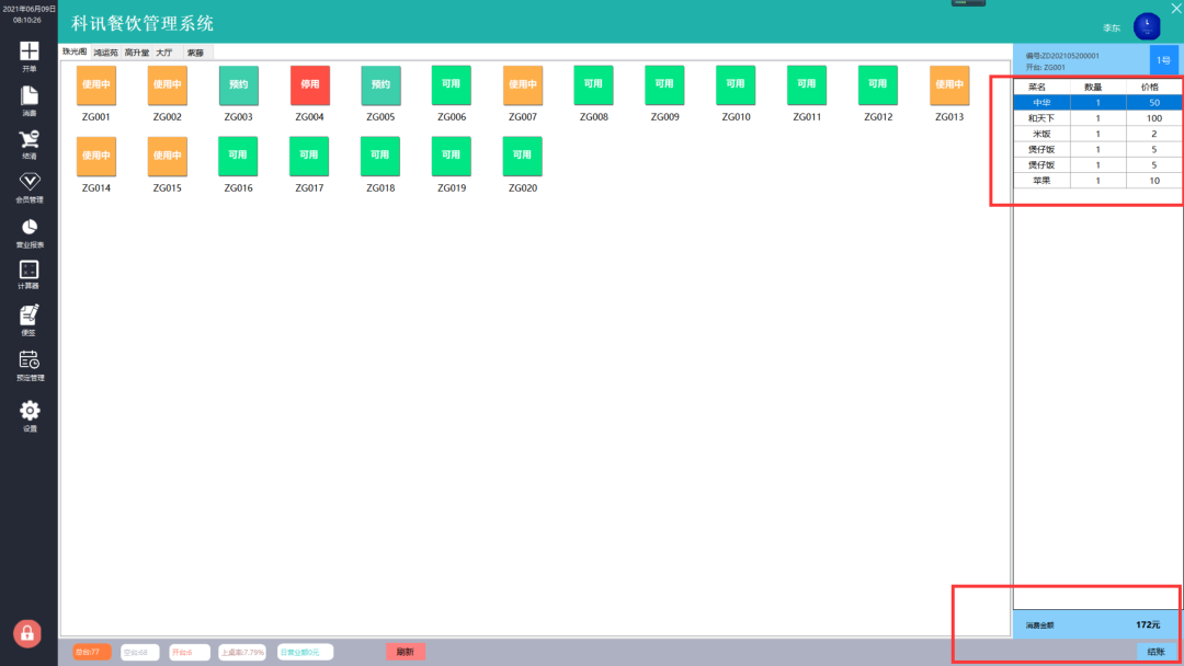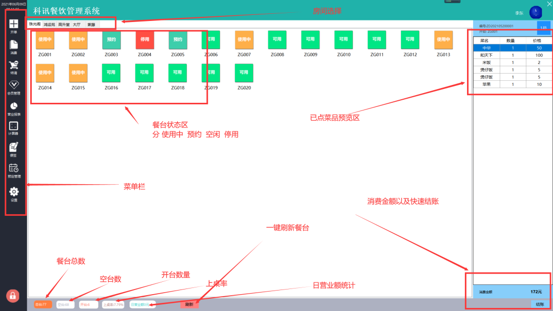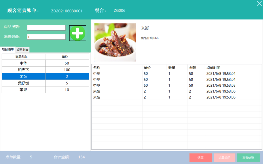 开单消费:支持选择餐桌、输入用餐人数、点餐、退菜等操作,并自动计算订单总额。 -