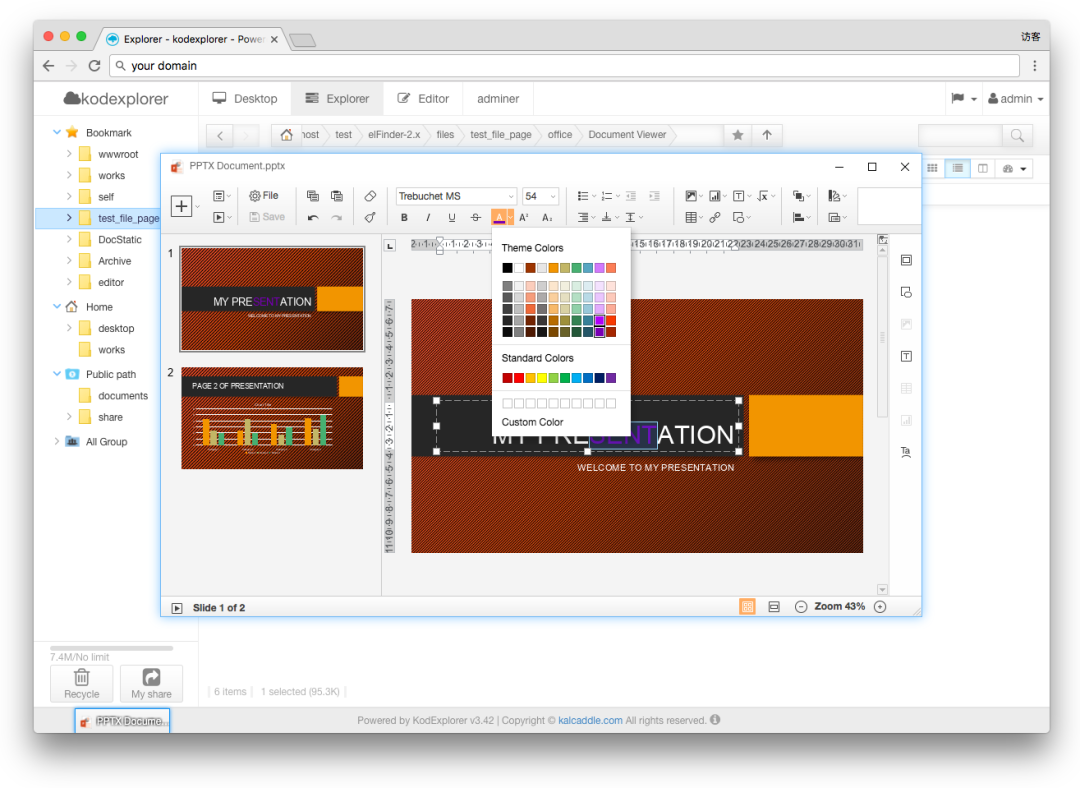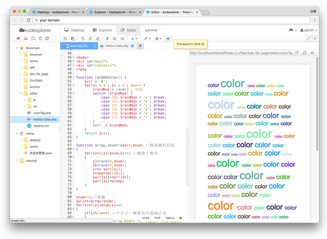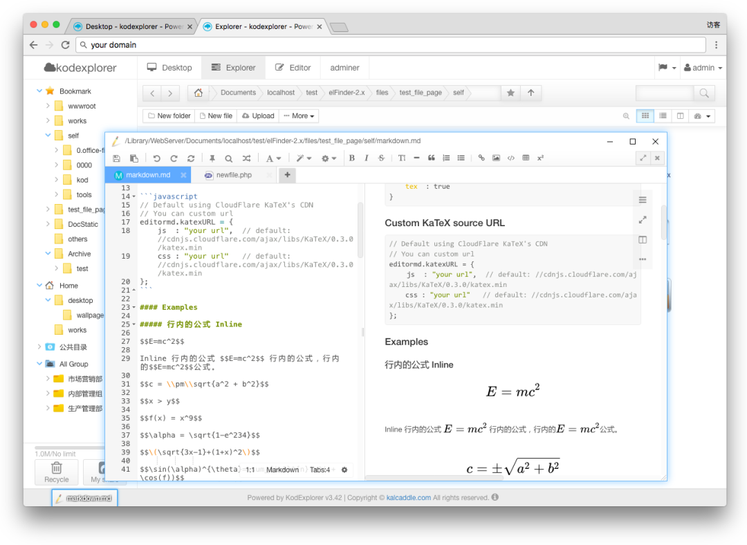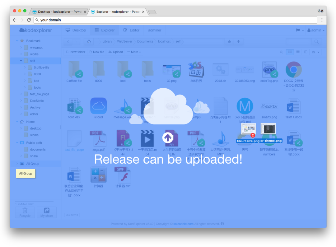 KodExplorer是一款快捷高效的私有云和在线文档管理系统,为个人网站、企业私有云部署、网络存储、在线文档管理、在线办公等提供安全可控,简便易用、可高度定制的私有云产品。项目采用Windows风格界面、操作习惯,无需适应即可快速上手,支持几百种常用文件格式的在线预览,可扩展易定制。