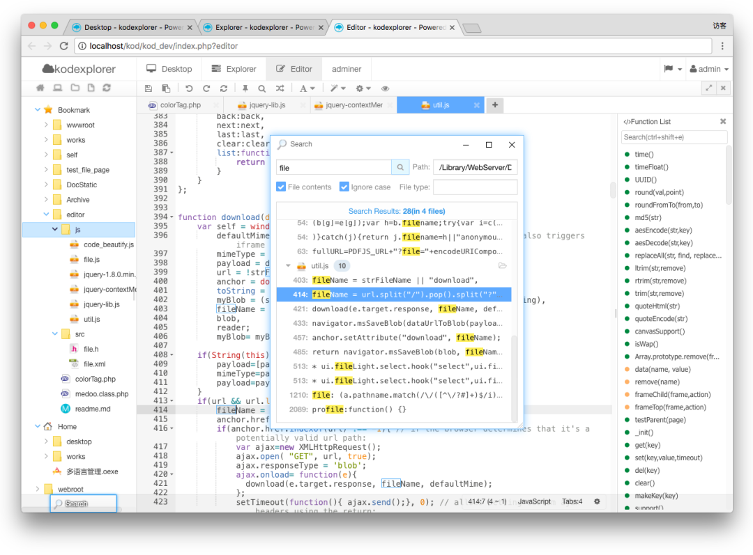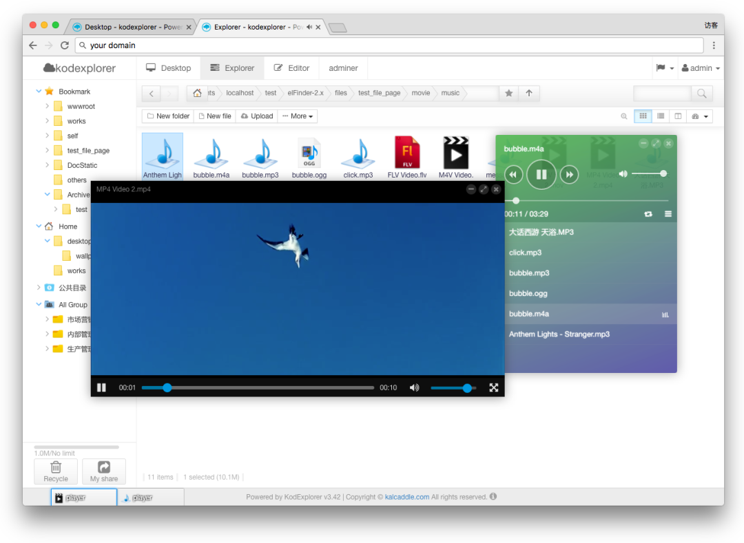 框中选择,拖拽移动,拖拽上传,在线编辑器,影音播放器,解压缩。全面ajax保证性能和体验。 -