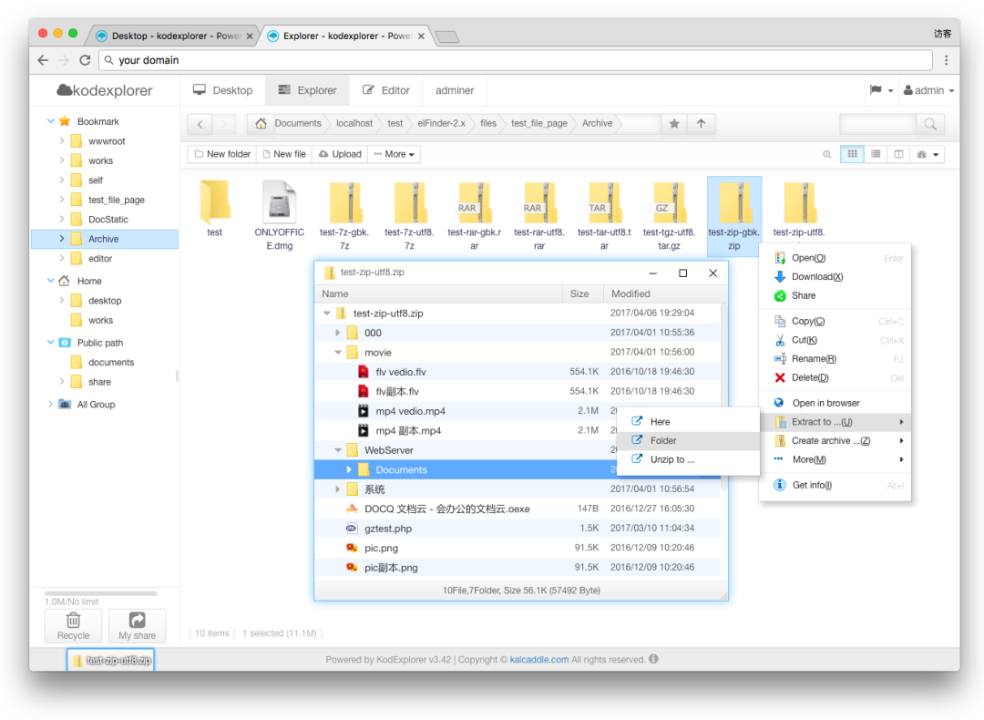 压缩文件:支持zip,rar,7z,tar,gzip,tgz 等压缩文件直接在线预览,而无需先解压;可以打开压缩包内的文件,同时支持打开方式选择。