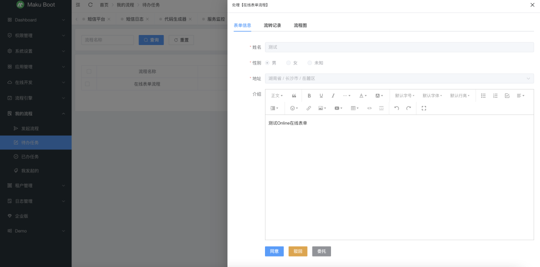支持Flowable7工作流,包括流程设计、自定义表单、在线Online表单、会签、或签等。 -