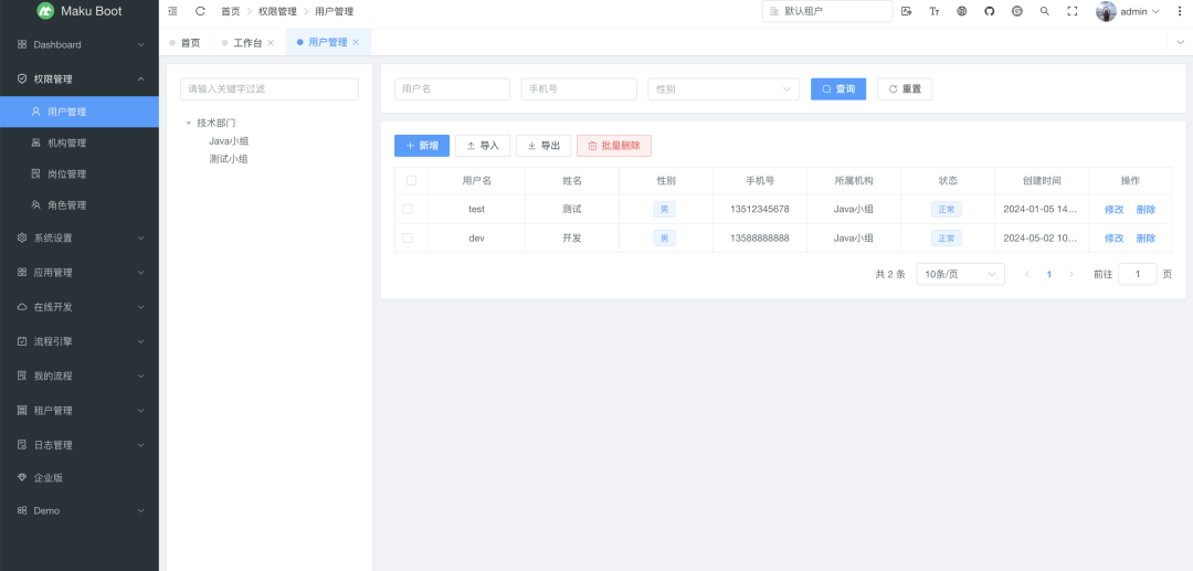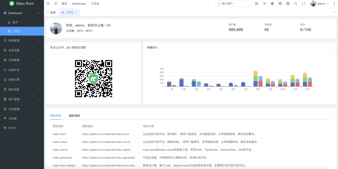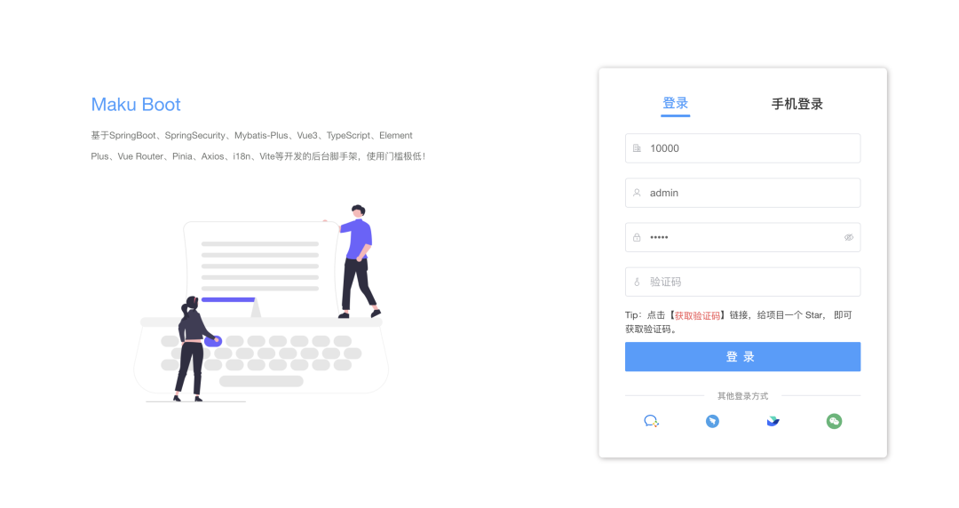 maku-boot是一款前后端分离架构 SpringBoot3.4、SpringSecurity6.4、Mybatis-Plus、Vue3、Element-Plus等技术开发的低代码开发平台,旨在为开发者提供一个简洁、高效、可扩展的低代码开发平台。使用门槛极低,支持国密加密、达梦数据库等,符合信创需求的低代码开发平台。