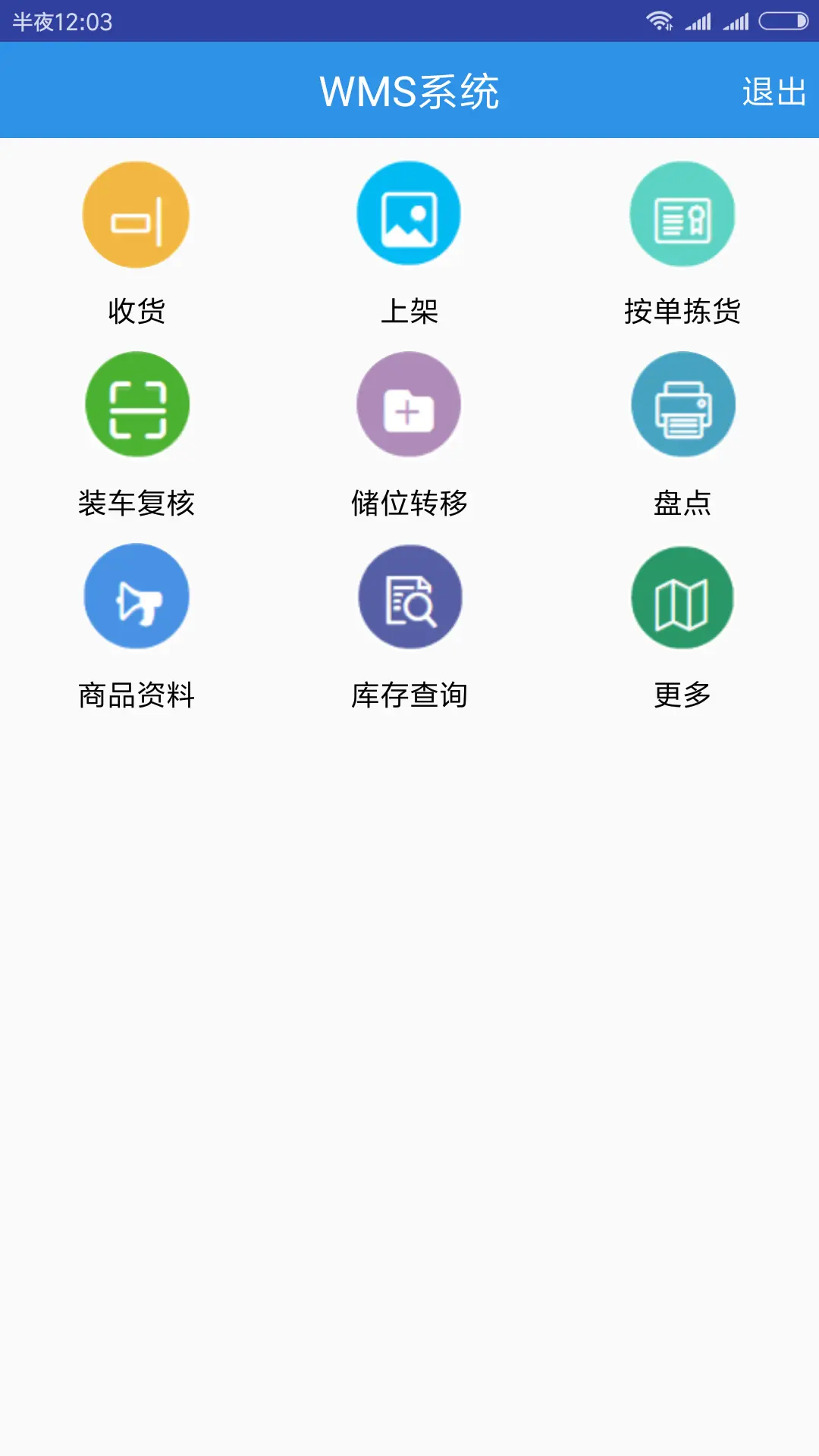 计费配置、仓库配置、基础配置、计费管理、基础资料、仓库管理、月台管理、进货管理、出货管理、退货管理、库内管理、盘点管理、库存查询、PDA功能、分析报表、分析图表、域验证。