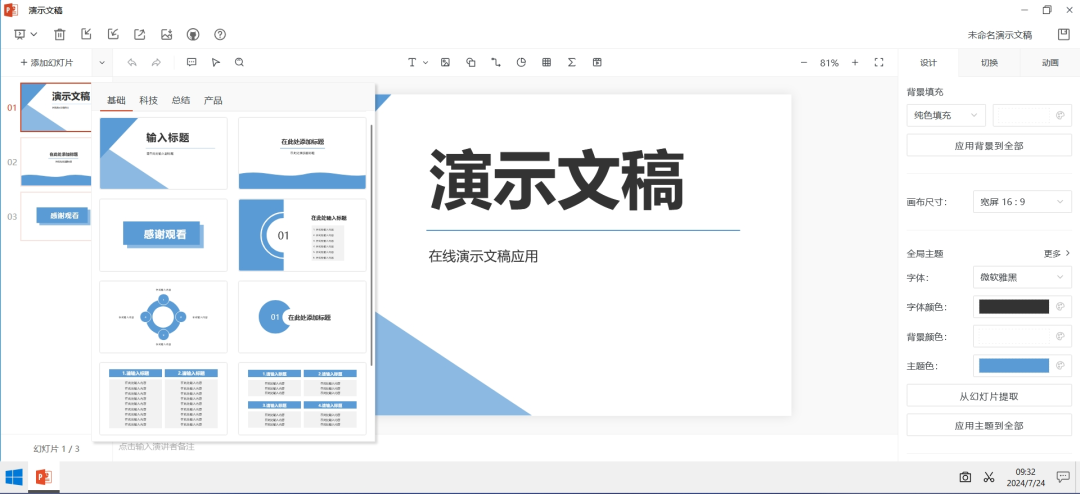 演示文稿:支持文字、图片、形状等多种元素的编辑和展示。 -