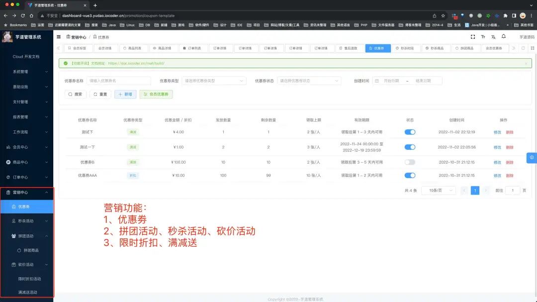 优惠券:支持发放和使用优惠券,用户可以在购物时使用优惠券抵扣金额。 -