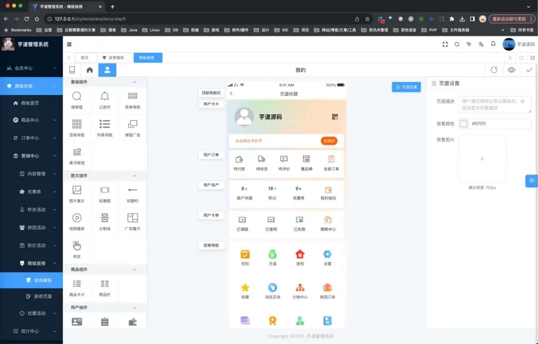 芋道商城是一个基于 Java、Vue3 和 Uniapp 商城项目,支持分销、拼团、砍价、秒杀、优惠券、积分、会员等级、小程序直播、页面 DIY 等功能。