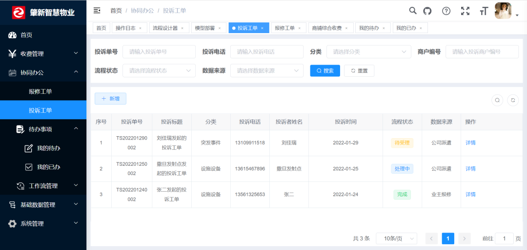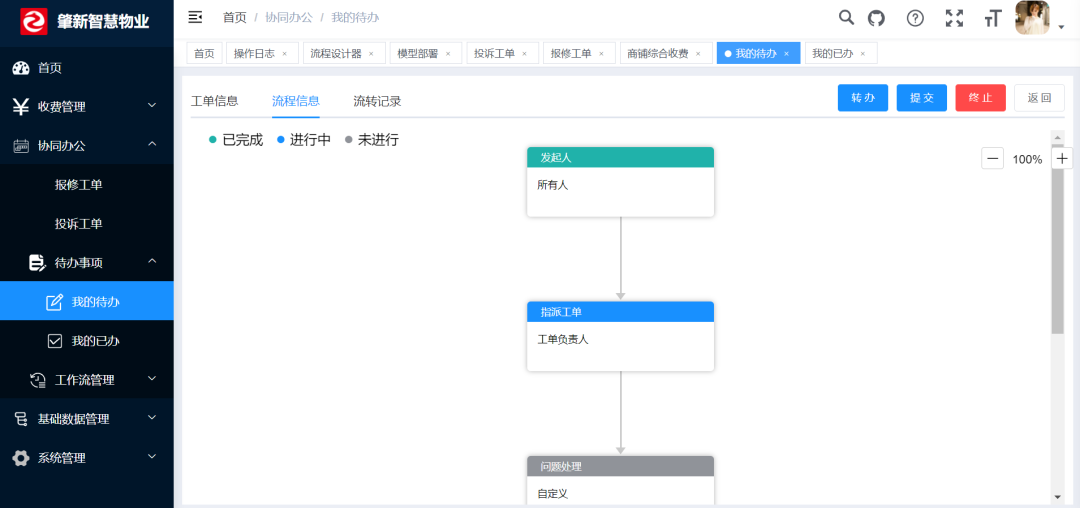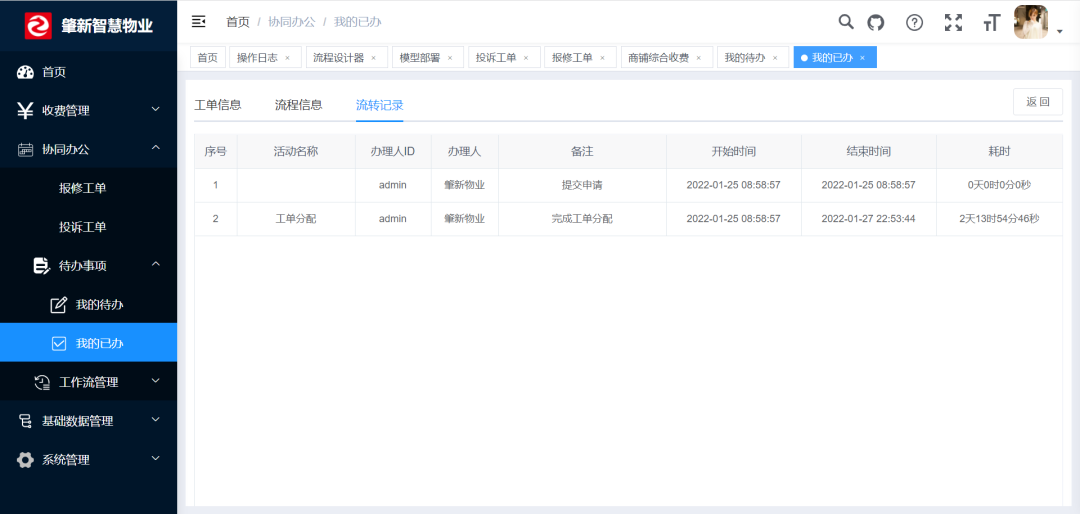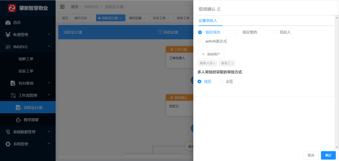 协同办公:基于activiti独立开发了流程设计器,仿钉钉风格,支持报修、投诉等工单流程。