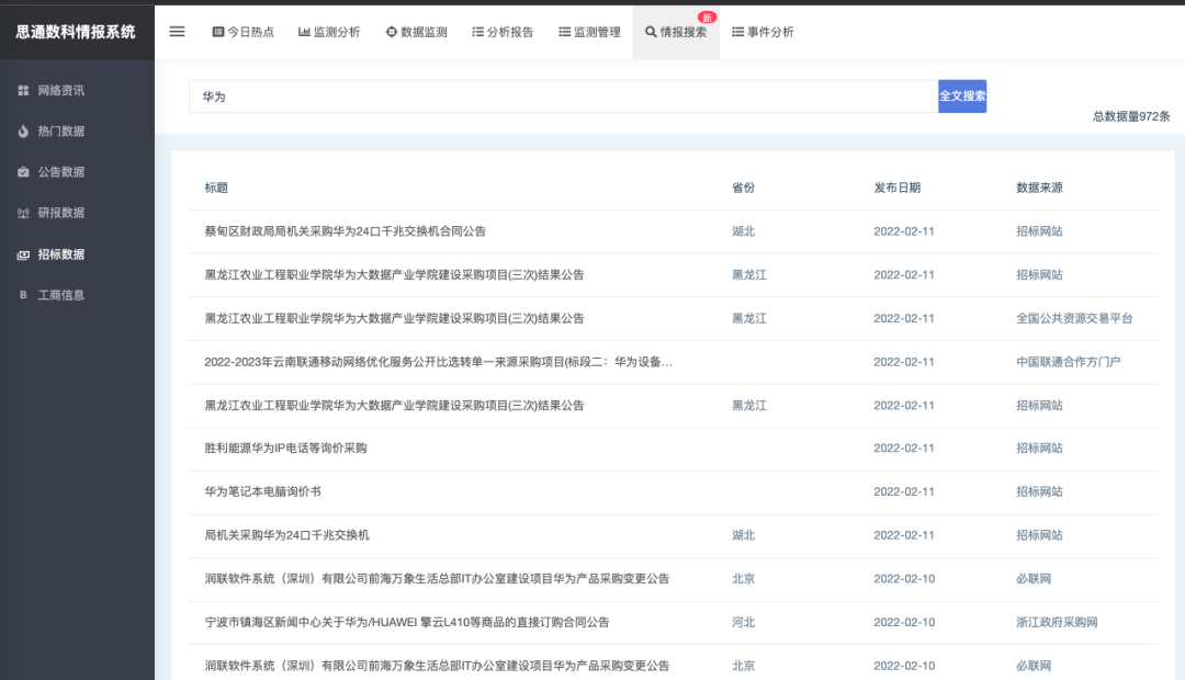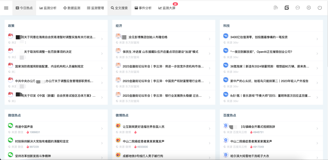 舆情监测:通过全文搜索、来源搜索、热搜监测等功能,实现对全网舆情的实时发现。 -