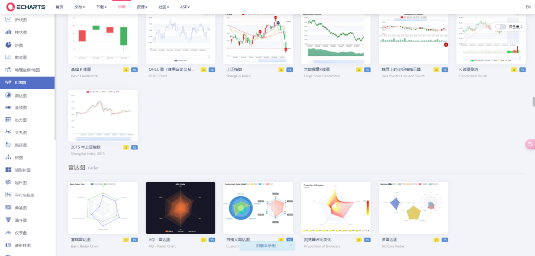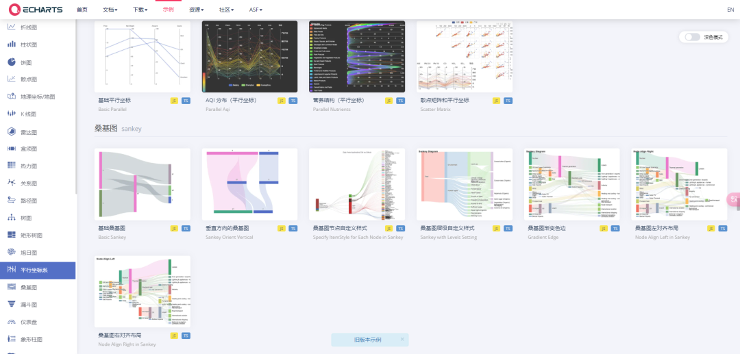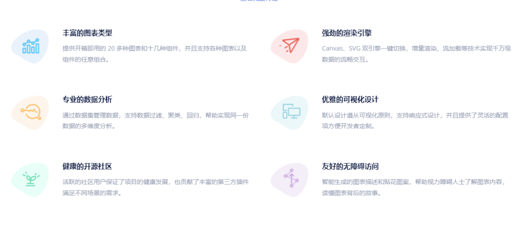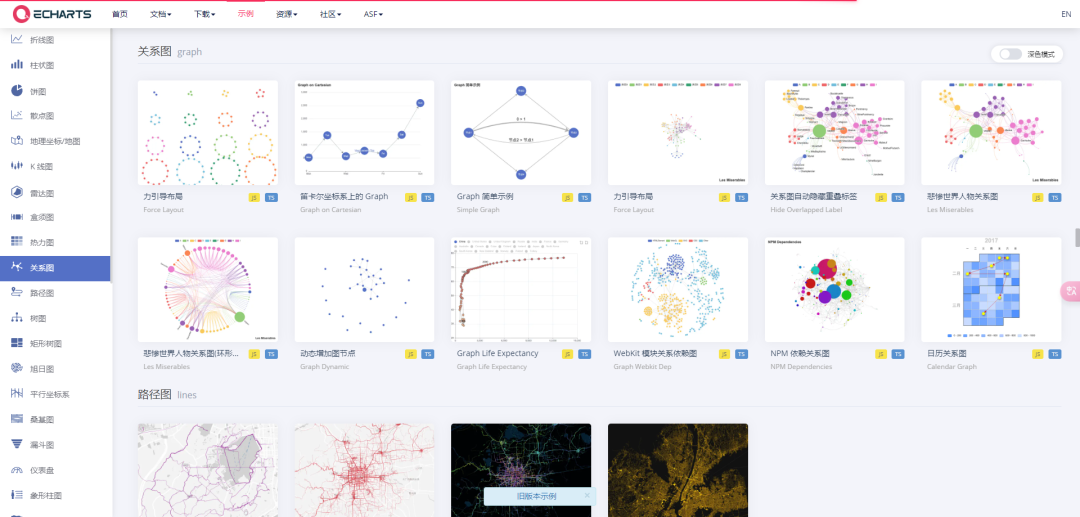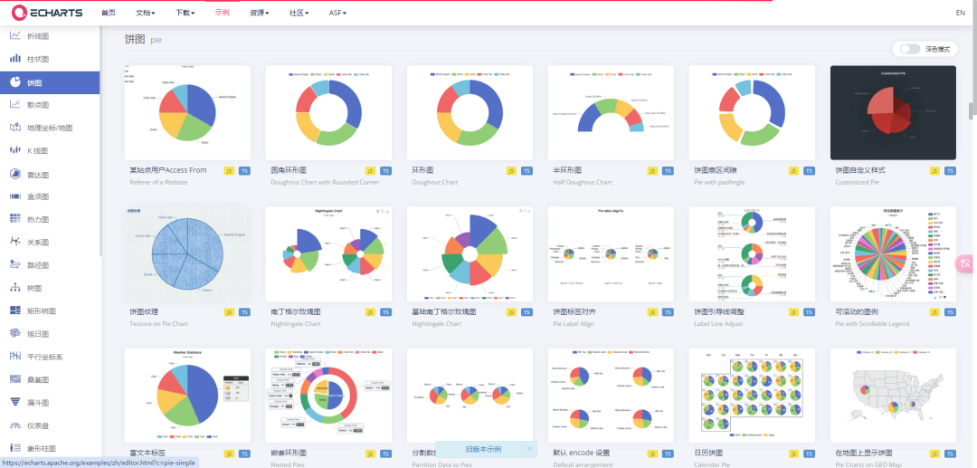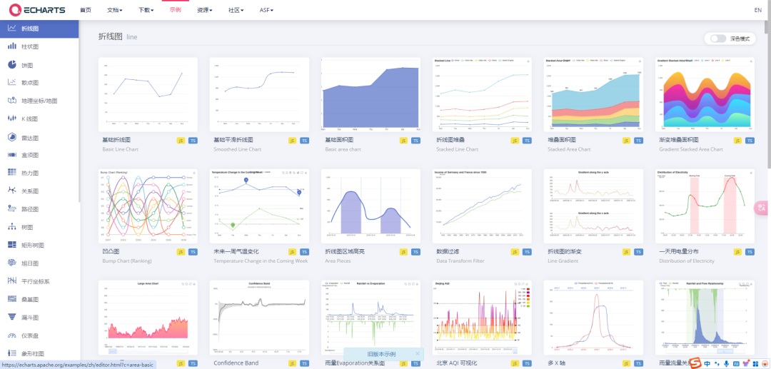 ECharts 提供了常规的折线图、柱状图、散点图、饼图、K线图,用于统计的盒形图,用于地理数据可视化的地图、热力图、线图,用于关系数据可视化的关系图、treemap、旭日图,多维数据可视化的平行坐标,还有用于 BI 的漏斗图,仪表盘,并且支持图与图之间的混搭。