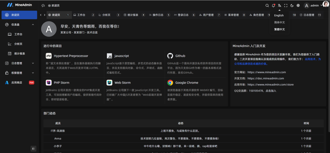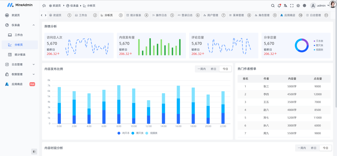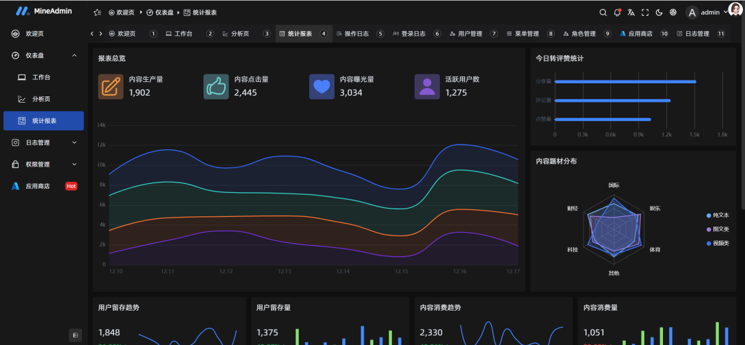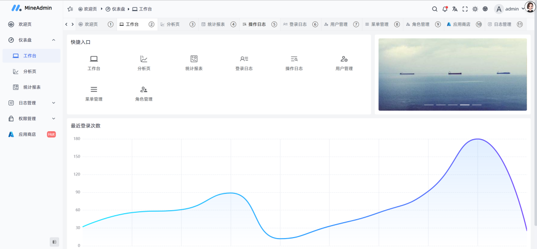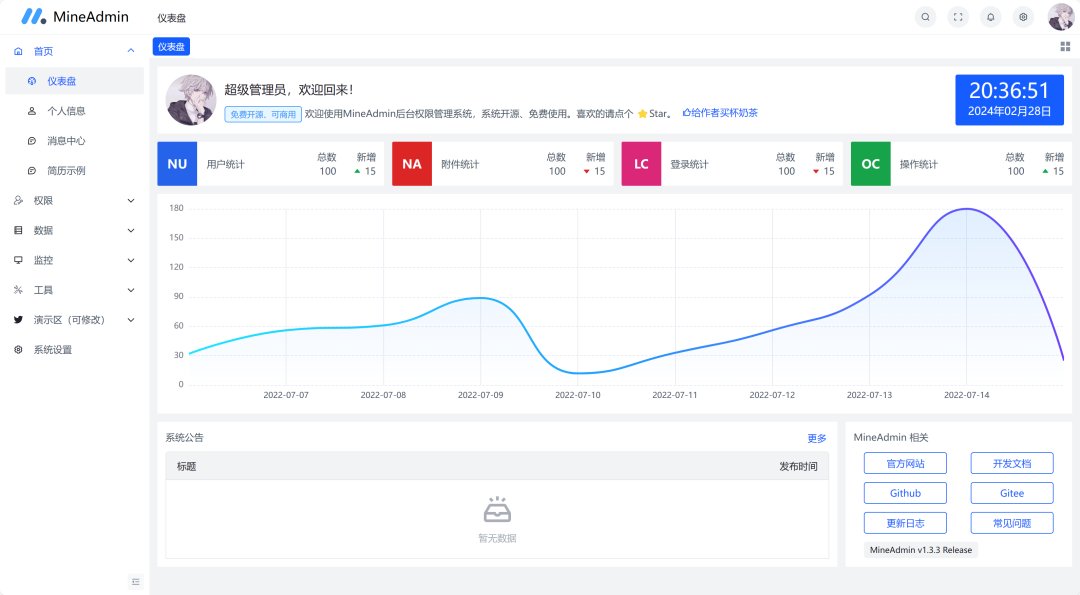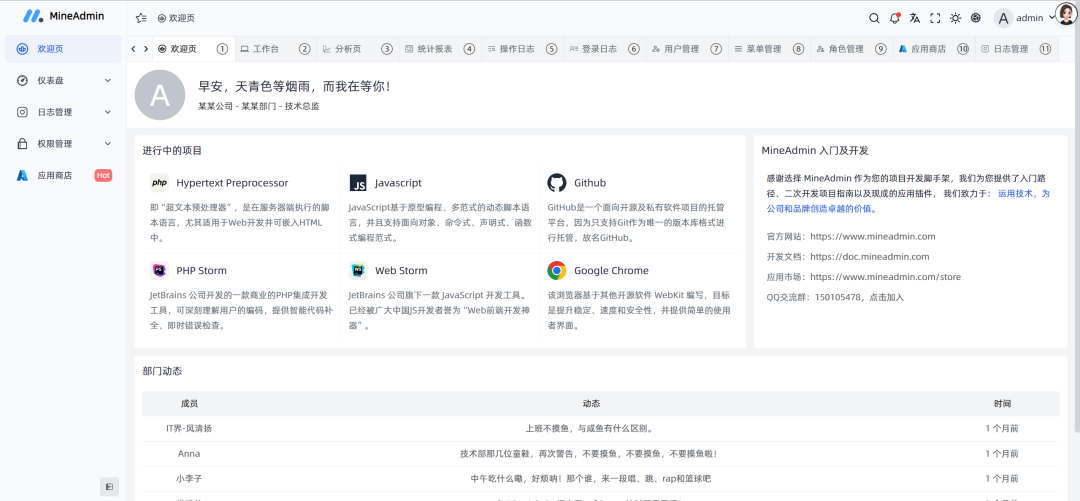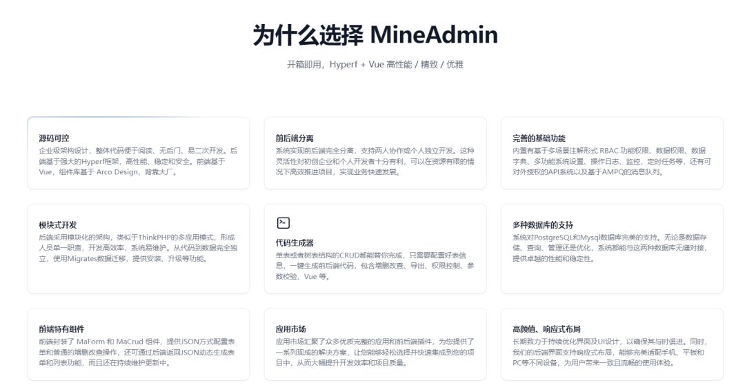 MineAdmin是一款基于 Hyperf 框架和 Vue3 + Vite5 开发的开箱即用、功能强大的前后端分离权限管理系统,自适应多终端。