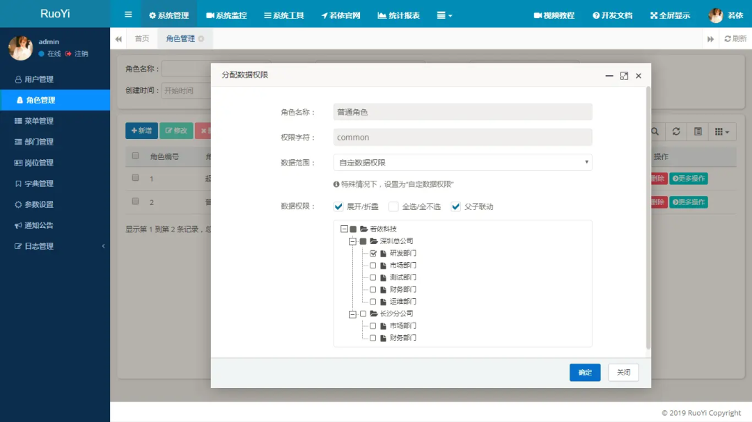 部门管理:配置系统组织机构,树结构展现支持数据权限。 -