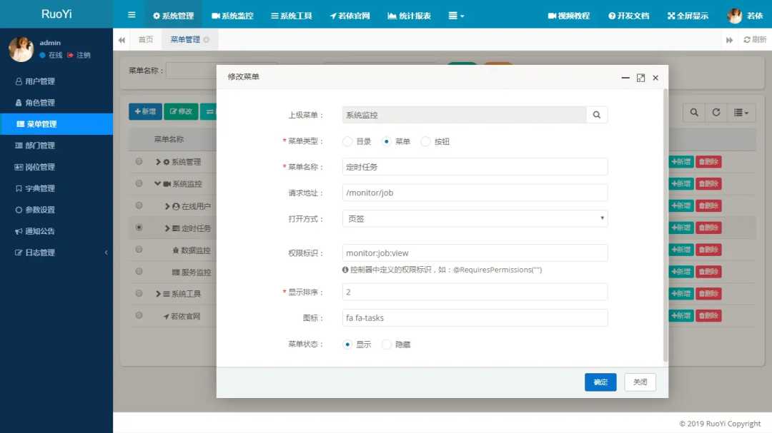 定时任务:在线任务调度,包括添加、修改、删除任务,以及执行结果日志。 -