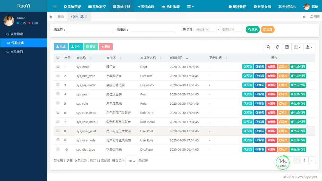 代码生成:前后端代码的生成(java、html、xml、sql),支持CRUD下载。 -