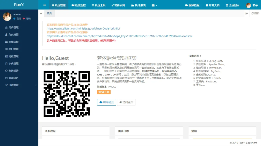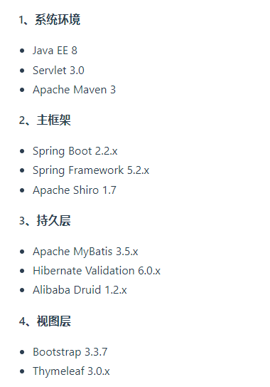 RuoYi(若依)是一款基于SpringBoot开发的轻量级Java快速开发框架,代码基于MIT License协议基于经典技术组合(Spring Boot、Apache Shiro、MyBatis、Thymeleaf)主要目的让开发者注重专注业务,降低技术难度,从而节省人力成本,缩短项目周期,提高软件安全质量。