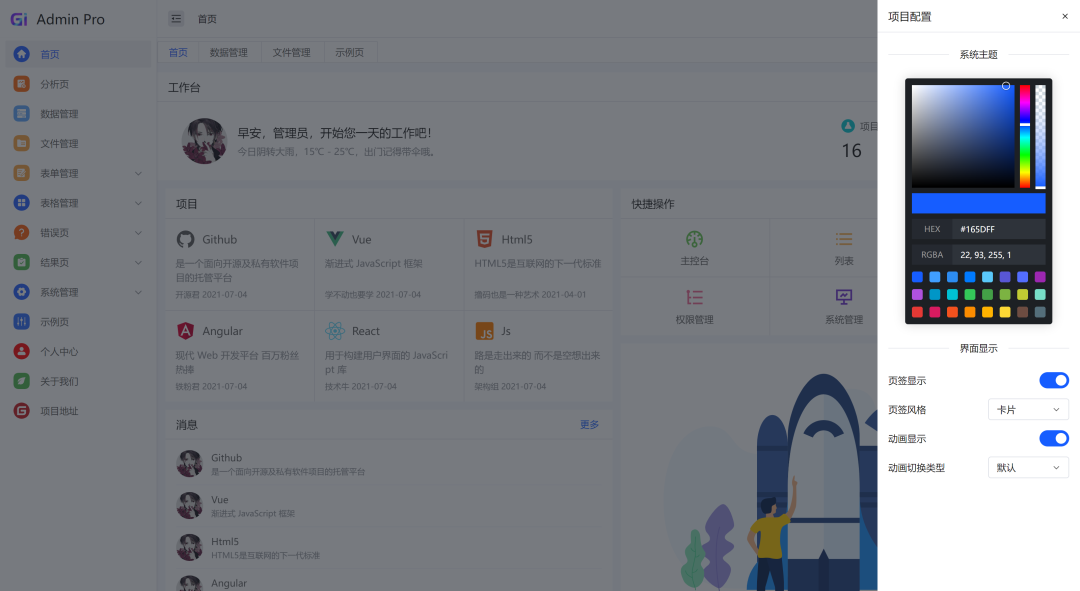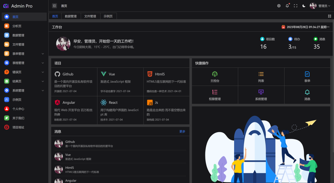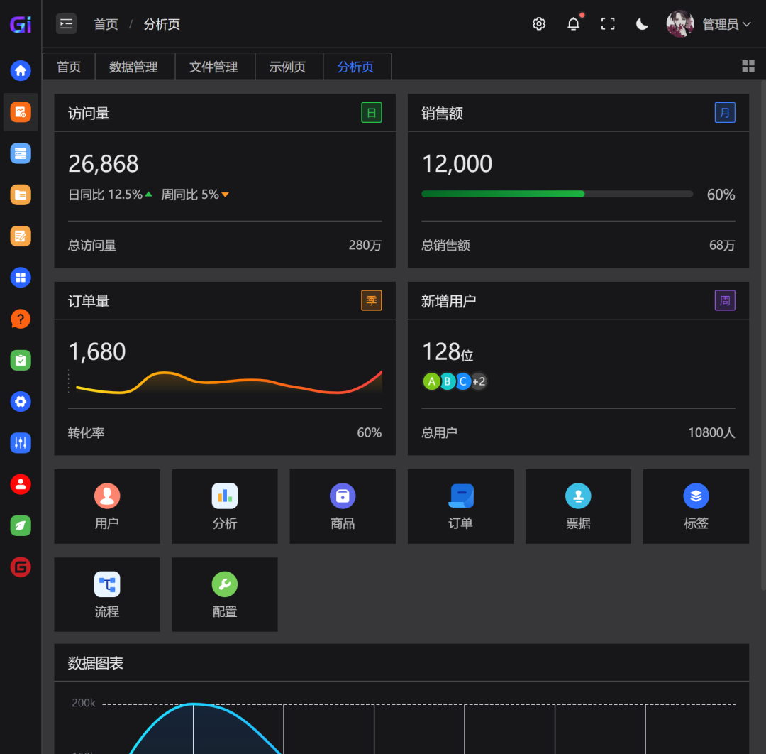 Gi Admin Pro 是一个基于 Vue3、Vite、TypeScript、Arco Design Vue、Pinia、VueUse 等的中后台模版,它使用了最新的前端技术栈,内置丰富的主题配置,有着极高的代码规范,基于 mock 实现的动态数据展示,开箱即用的模板,适用于需要快速构建中后台管理系统的开发者,同时也非常适合作为学习参考。