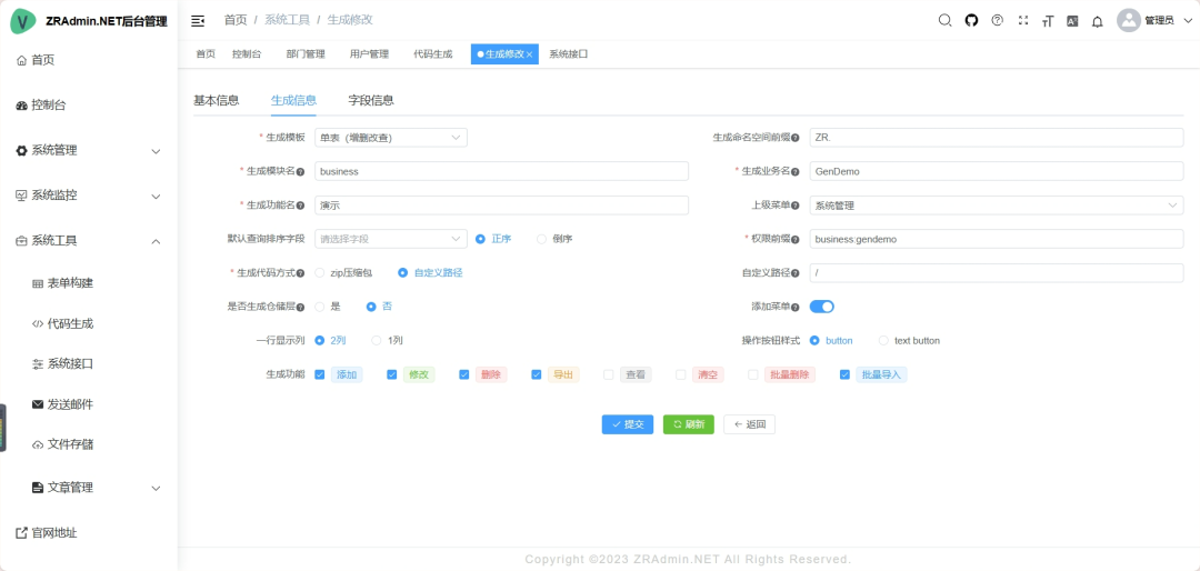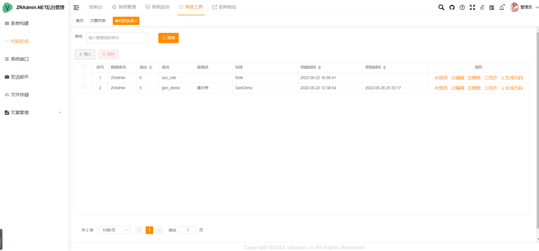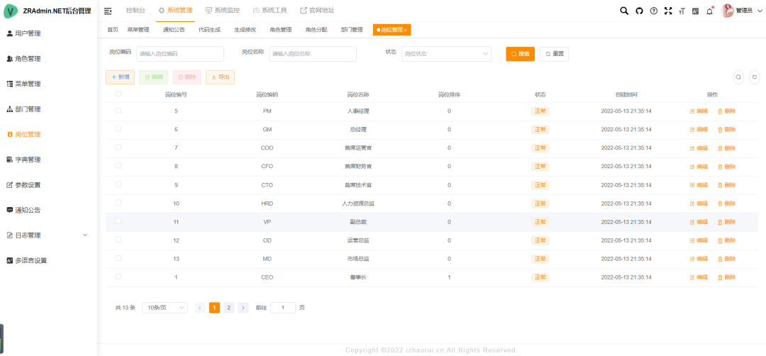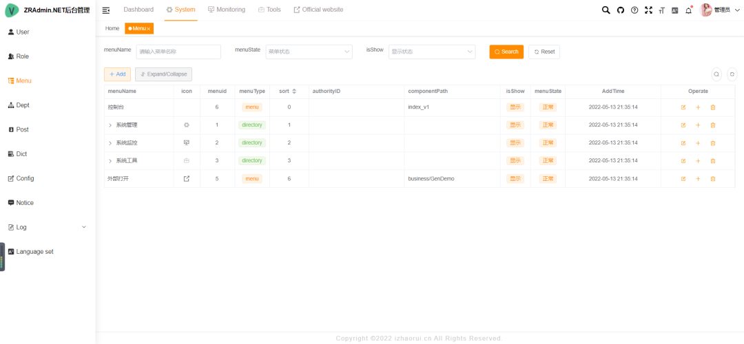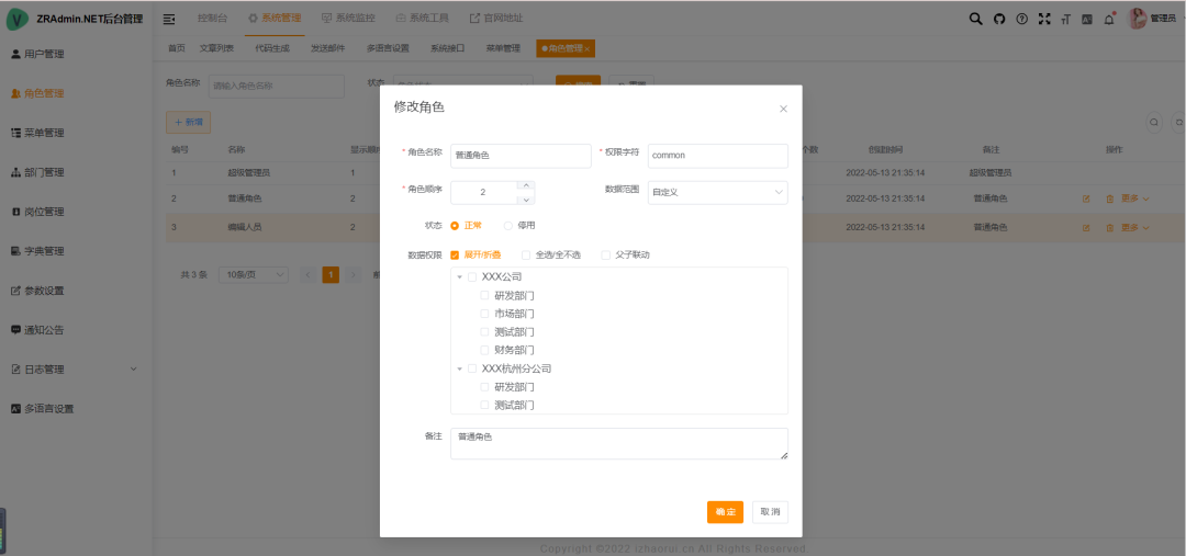 ZR.Admin.NET是一款前后端分离的、跨平台基于RBAC的通用权限管理后台。整合最新技术高效快速开发,前后端分离模式,开箱即用。代码量少、学习简单、通俗易懂、功能强大、易扩展、轻量级,让 web 开发更快速、简单高效(从此告别 996),解决 70%的重复工作,专注您的业务,轻松开发从现在开始!