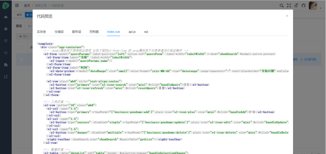 代码生成:高效率开发,代码生成器可以一键生成所有前后端代码。 -