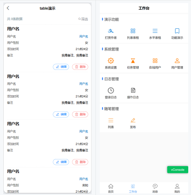 操作日志、登录日志、系统接口、服务监控、在线构建器、任务系统、文章管理。