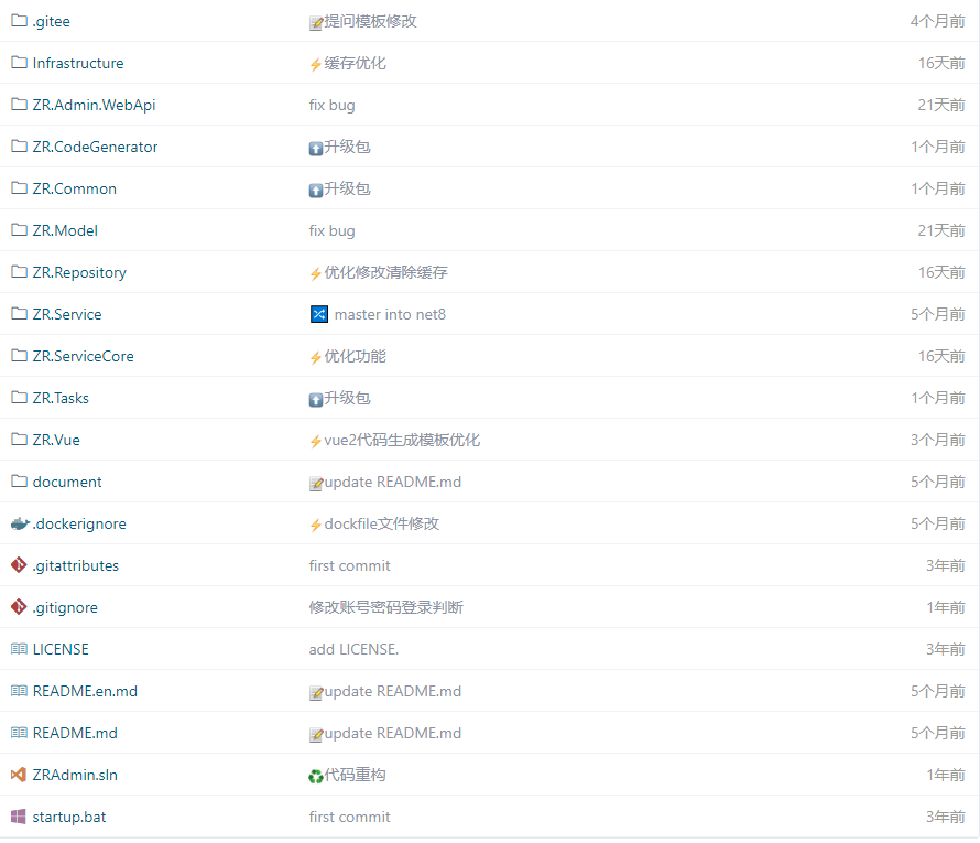 ├─ZR.Admin.WebApi ->[webapi接口]:为Vue版或其他三方系统提供接口服务。