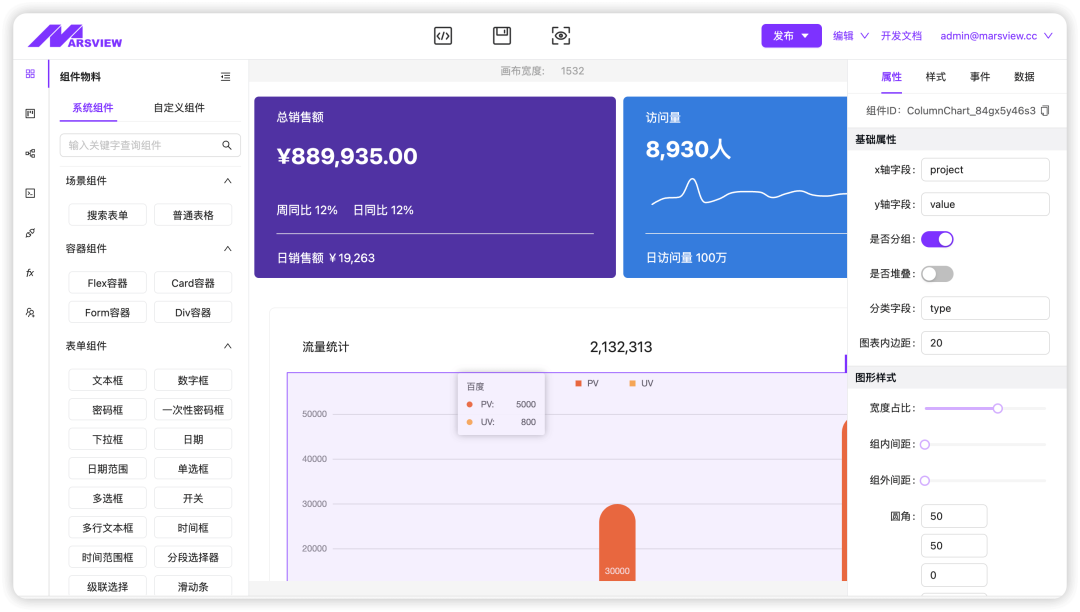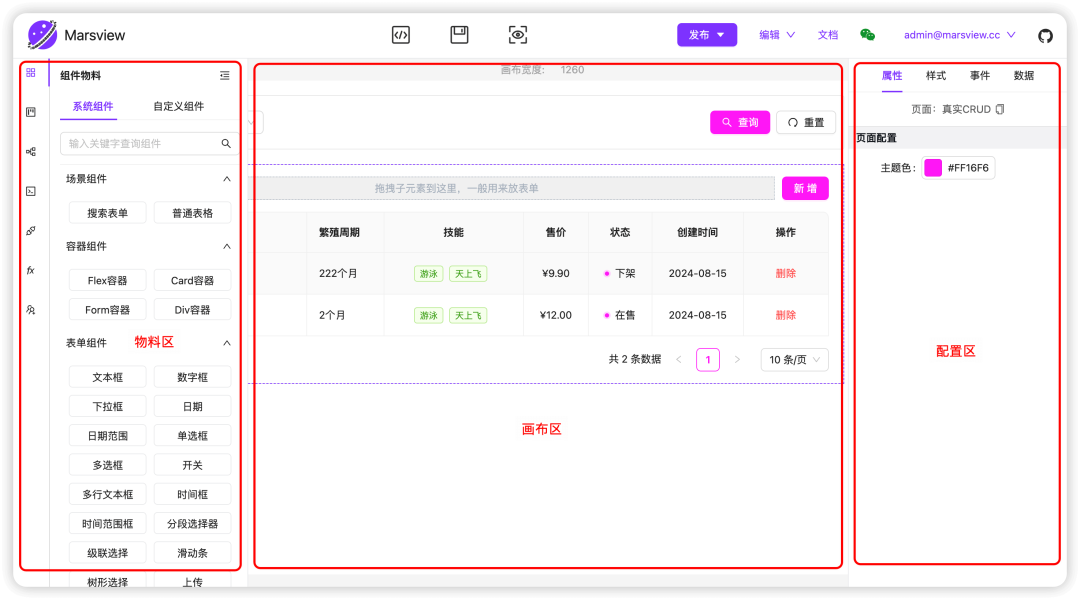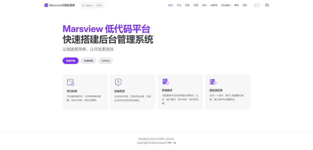 Marsview一款面向中后台(MIT License协议)的低代码可视化搭建平台,开发者可以在平台上创建项目、页面和组件,支持事件交互、接口调用、数据联动和逻辑编排等,开发者还可通过微前端框架 microApp 快速集成到自己的业务系统中。