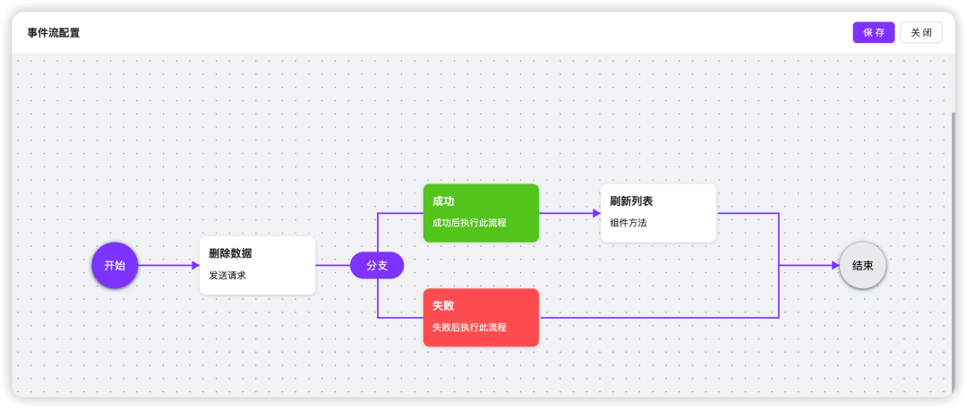 事件流:通过事件流可以完成高难度的业务逻辑编排,如组件联动、组件可见性和隐藏、组件禁用、自定义逻辑处理、接口调用、路由跳转等。 -