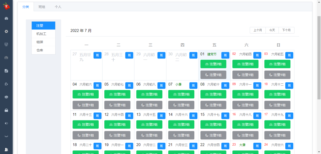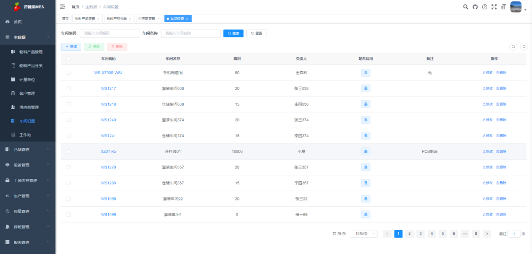 PC端:包括系统管理、主数据、生产管理、生产排产、质量管理、生产排班、仓储管理、设备管理、统计报表、大屏展示等功能。
