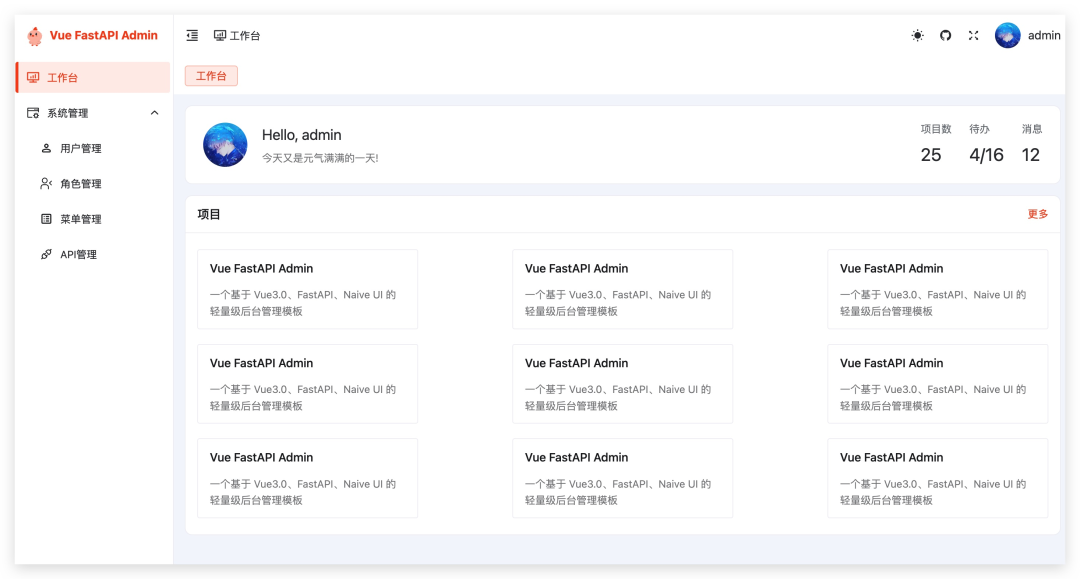 vue-fastapi-admin 是一个基于 FastAPI + Vue3 + Naive UI 的现代化前后端分离开发平台。该项目融合了 RBAC 权限管理、动态路由和 JWT 鉴权,旨在助力中小型应用快速搭建,并可作为学习参考的典范。