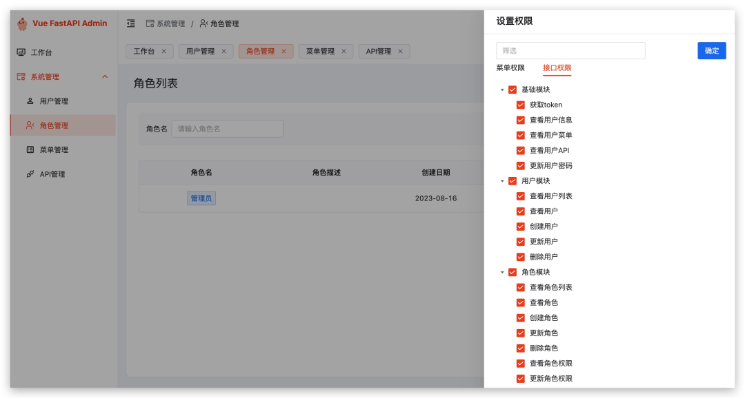 权限控制:基于RBAC模型实现细粒度的权限控制,包括按钮和接口级别的权限。 -