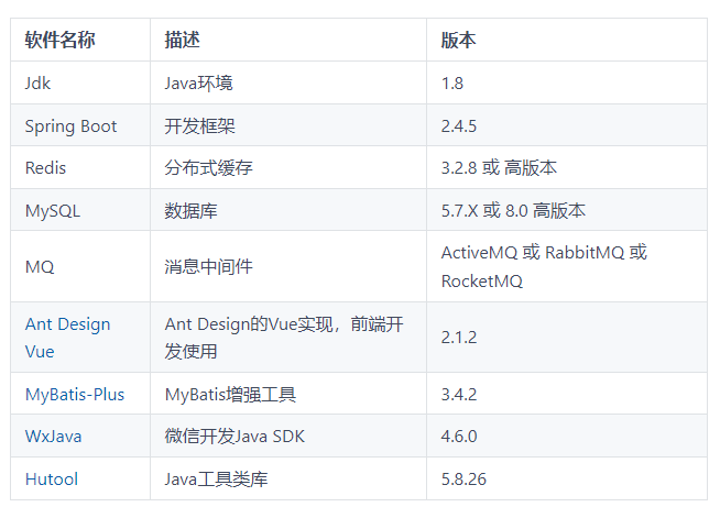 技术栈:包含Java(JDK 1.8)、Spring Boot(2.4.5)、Redis(3.2.8或更高版本)、MySQL(5.7.X或8.0高版本)、MQ消息中间件(ActiveMQ、RabbitMQ或RocketMQ)等核心技术。 -