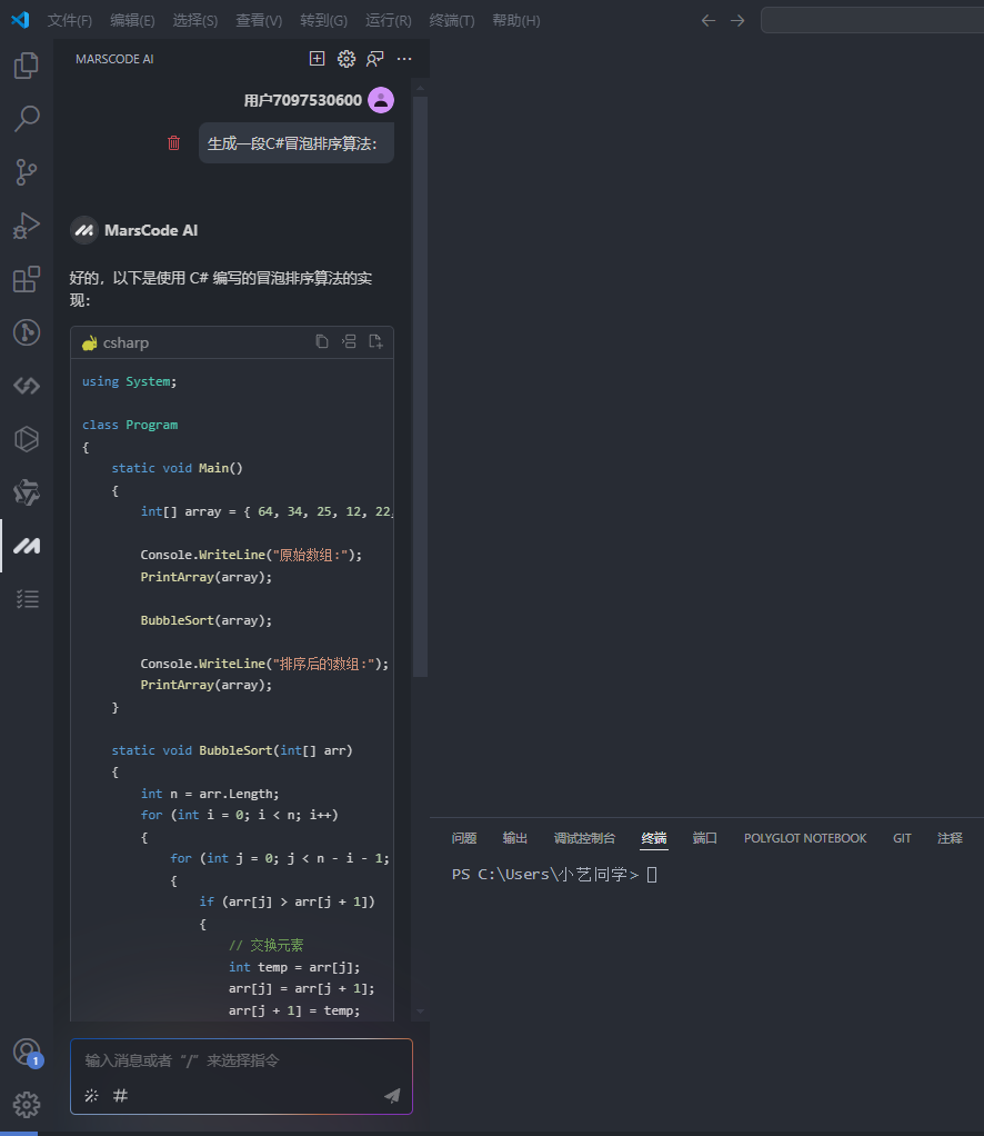 豆包 MarsCode 编程助手可以根据你的自然语言描述生成对应的代码片段。生成一段C#冒泡排序算法:
