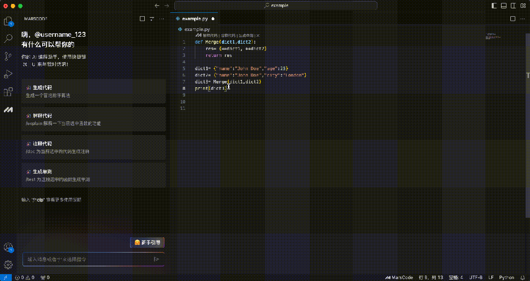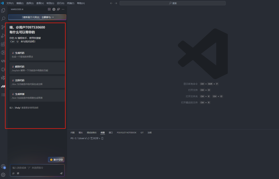 使用快捷键(Windows: Ctrl + U; macOS: Command + U)打开豆包 MarsCode 编程助手侧边对话框。 -