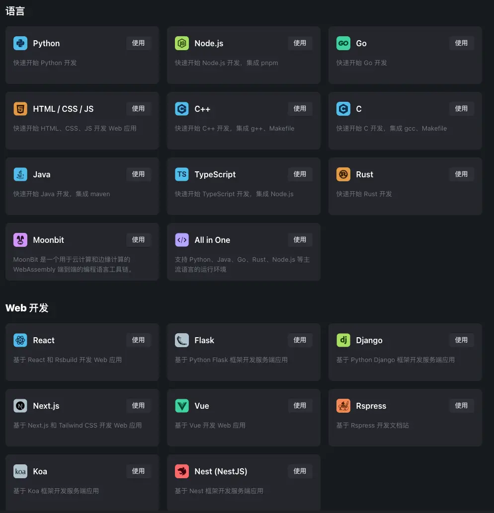 提供 C、C++、Go、JavaScript、Java、Node.js、Rust、TypeScript 等语言的开发环境和模板,避免繁琐的环境配置,让你将更多精力放在产品开发上。