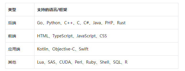 支持超过 100 种编程语言,如:Go、Python、C++、C、C#、Java、PHP、Rust等等。