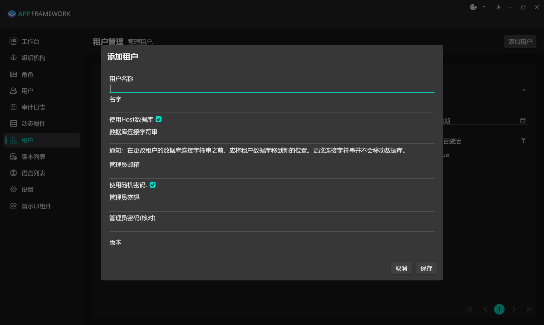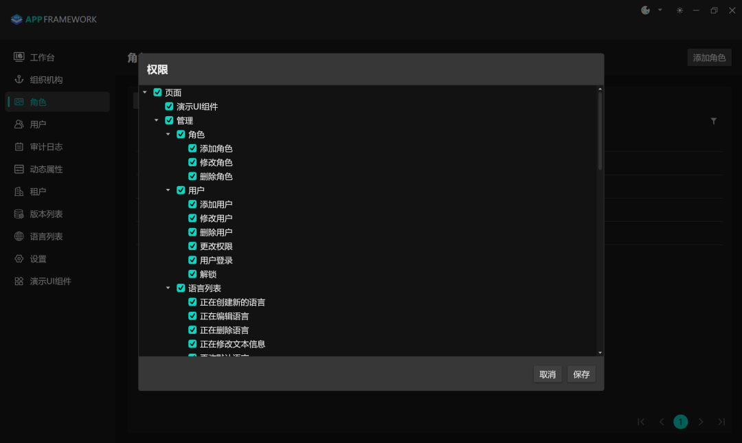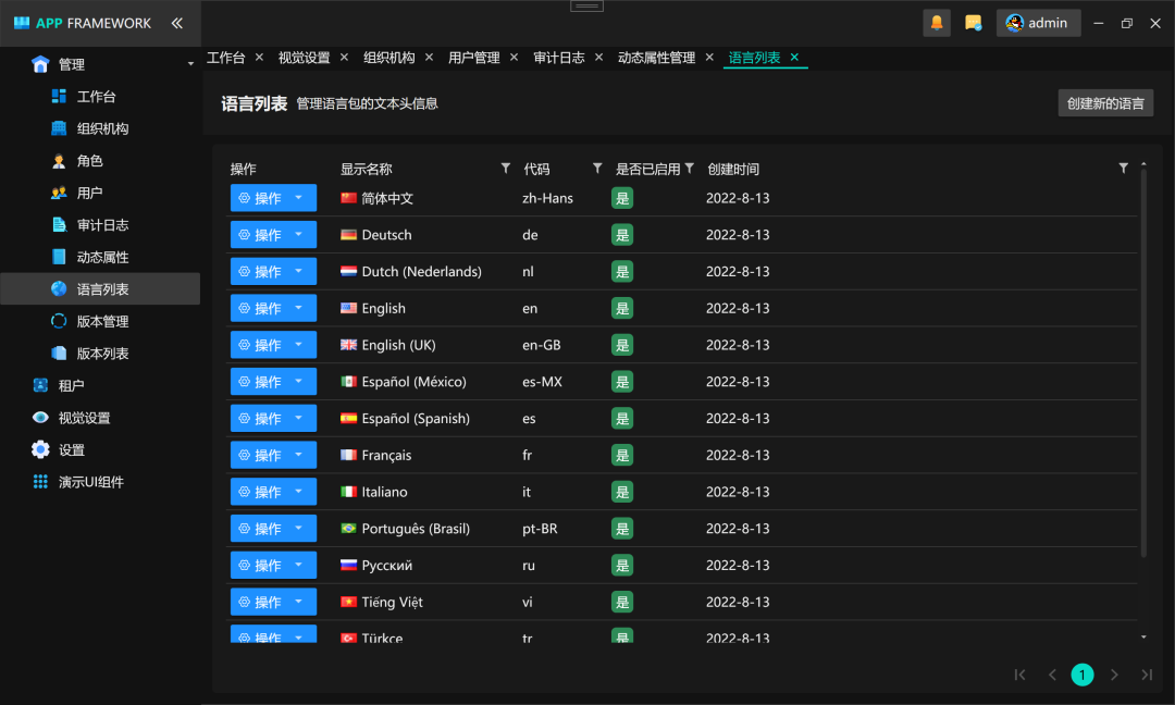 用户与角色管理、组织机构、权限管理、多租户、即时通讯、本地化多语言、身份认证及授权、审计日志记录、UI主题、异常处理、数据字典、系统设置等。