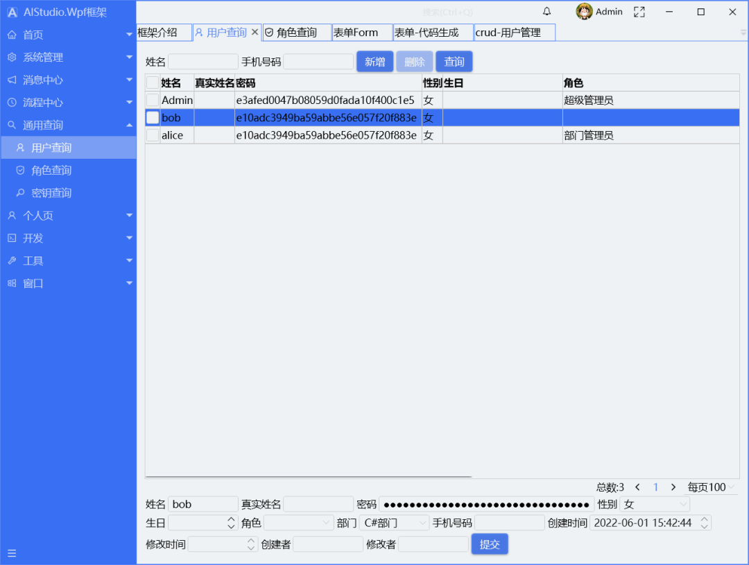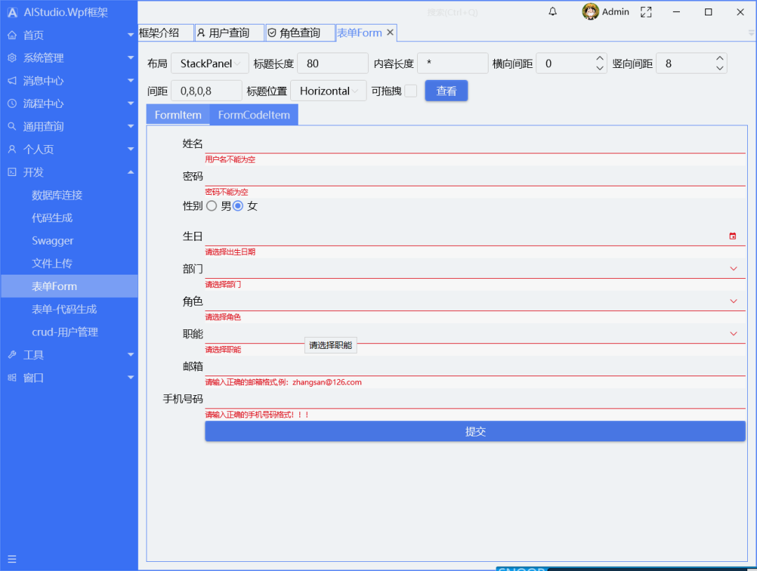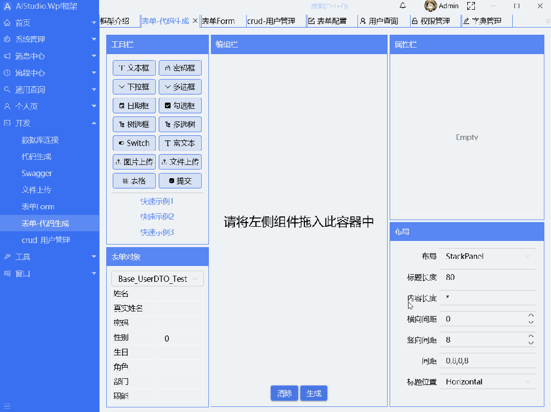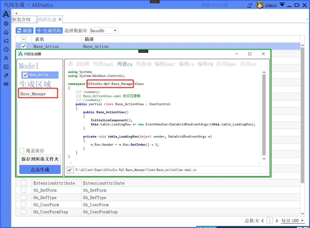 代码生成器:内置了代码生成器,支持从数据库表自动生成对应的 WPF 页面和 ViewModel,极大提高了开发效率。 -