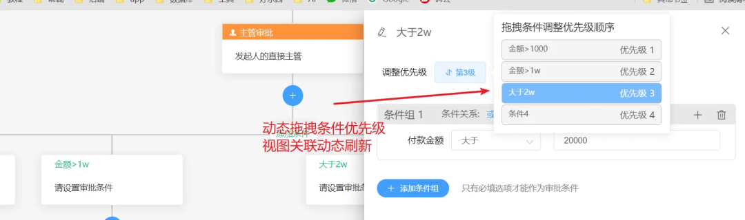 自定义审批条件:支持自定义复杂流转条件,可视化流程逻辑分支条件,支持多种类型业务节点和配置校验。