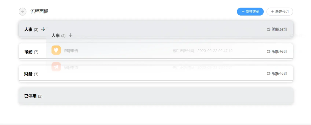 表单管理:支持工作流表单管理,包括分组和单组表单的拖拽排序,以及表单的基本设置。 -