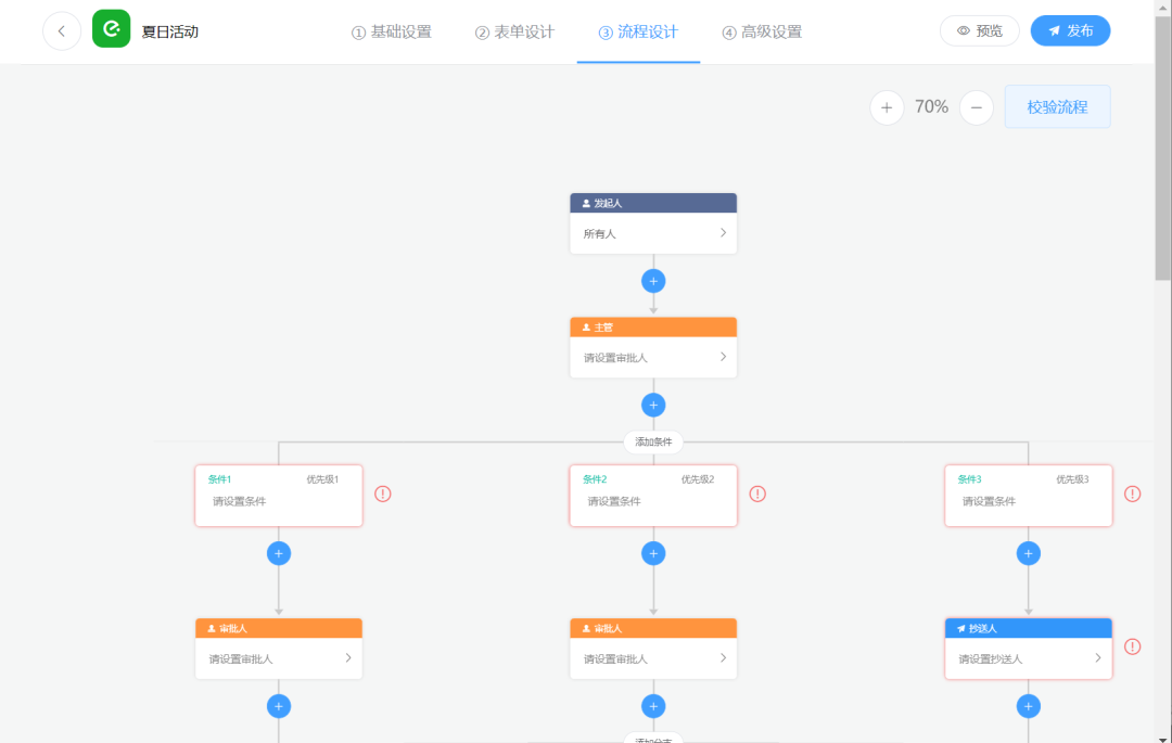 流程设计器:支持任意条件层级审批流程设计,审批节点支持多种业务类型设置,并具备流程校验功能。