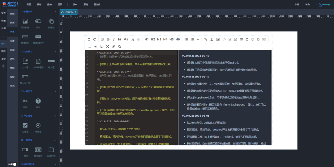 内置组件封装:可以将现有的WEB资源(如基于jquery的markdown)封装成内置组件,也可将element-ui、amis等代码或低代码框架的组件封装给UIOTOS使用。