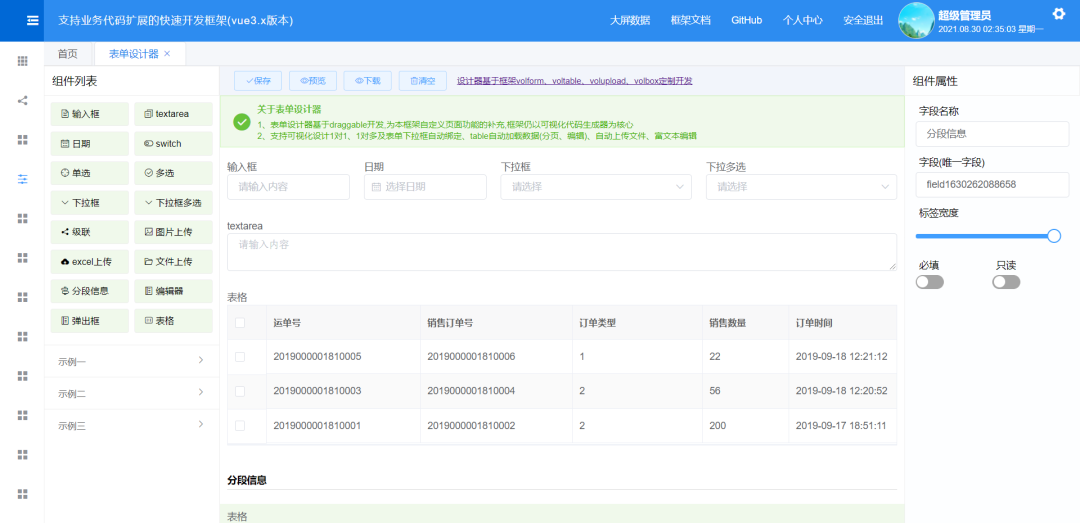 代码生成器:可在线配置30多种属性,直接生成主/从表前后端业务代码,支持一对一、一对多从表的全自动生成与数据源自动绑定。