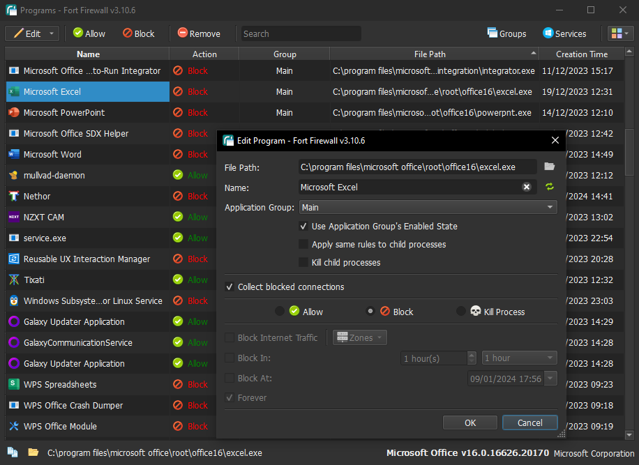 应用程序过滤:支持通过应用程序路径名中的通配符进行过滤,提高规则设置的灵活性。 -