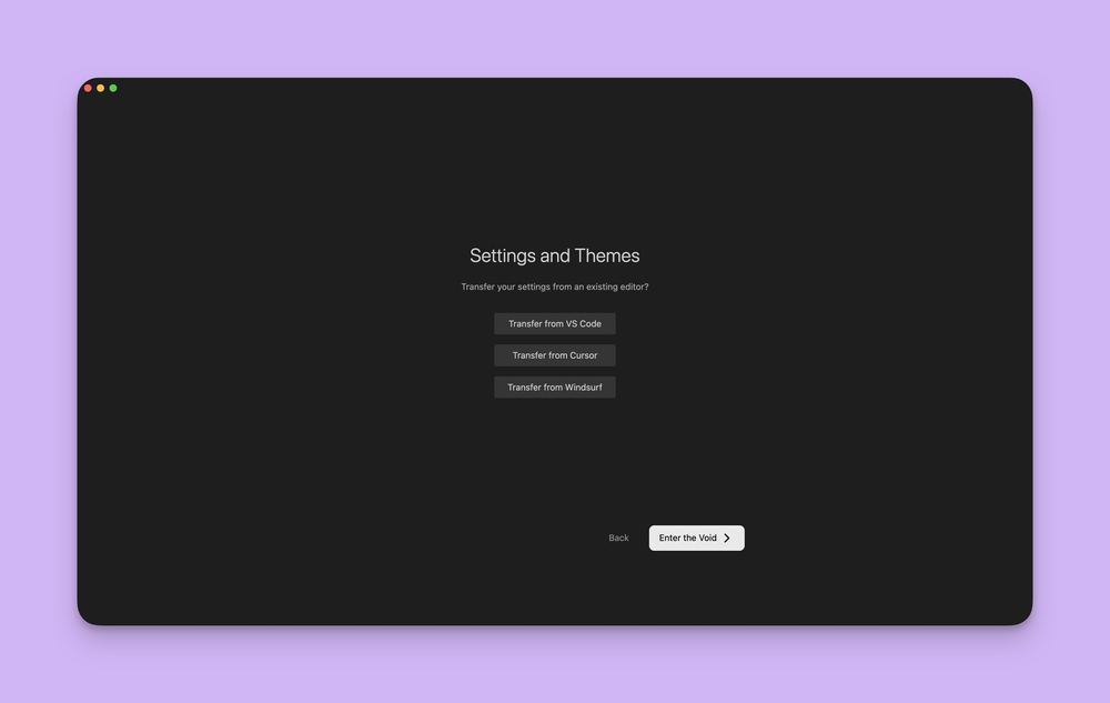 Void 是 VS Code 的分支开发的,允许一键迁移所有你的 VS Code 主题、快捷键和设置。